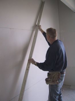 To get a nice straight wall there are a few critical points to keep in mind. Make sure the adhesive daubs are evenly spaced and are about the same size. The daubs should all sit proud of the wall, comming into a peak, this allows the sheet to flatten out the daubs without a lot of resistance giving you a good bond. Provided you get the adhesive right the sheets will sit flat and will not require much tapping back to get them straight.